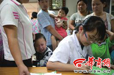 家長們紛紛議論說:“孩子平時都在幼兒園吃飯,今天下午3點(diǎn)在幼兒園吃的炒面,吃完后就出現(xiàn)不適了。”此時,40余名小孩已被安排輸液,因?yàn)檩斠菏乙褲M,部分小孩只好在外面輸液。一位家長不停地在樓道內(nèi)踱步,而輸液室內(nèi)孩子的哭鬧聲讓他顯得更加焦急。記者初步統(tǒng)計,發(fā)現(xiàn)值班醫(yī)生桌上孩子看病的收費(fèi)單已有60余張。同時,在渭南市第一醫(yī)院,還有16名小孩正在接受治療。