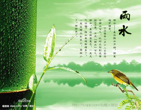 公歷每年二月十八日前后為雨水節(jié)氣,此時(shí)太陽(yáng)到達(dá)黃經(jīng)330度,為交“雨水”節(jié)氣。雨水,表示兩層意思,一是天氣回暖,降水量逐漸增多了,二是在降水形式上,雪漸少了,雨漸多了,《月令七十二候集解》中說(shuō):“正月中,天一生水。春始屬木,然生木者必水也,故立春后繼之雨水。且東風(fēng)既解凍,則散而為雨矣。”