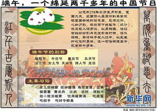 端午節(jié)是我國漢族人民的傳統(tǒng)節(jié)日,這一天必不可少的活動逐漸演變?yōu)槌贼兆,賽龍舟,掛菖?SPAN lang=EN-US>`蒿草、艾葉,薰蒼術(shù)、白芷,喝雄黃酒。據(jù)說,吃粽子和賽龍舟,是為了紀念屈原,所以解放后曾把端午節(jié)定名為“詩人節(jié)”,以紀念屈原。至于掛菖蒲、艾葉,薰蒼術(shù)、白芷,喝雄黃酒,則據(jù)說是為了避邪。