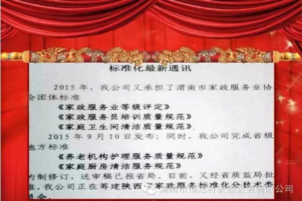 | 渭南市博思特家政服務(wù)有限公司 讓標準成為習(xí)慣 讓習(xí)慣符合標準 渭南市博思特家政服務(wù)有限公司制定標準206項,其中國家標準53項,行業(yè)標準5項,地方標準4項,企業(yè)標準144項,辦公室引用101項,家政部引用49項,工程部引用34項,人力資源部引用7項,財務(wù)部引用5項。 2014年8月發(fā)布陜西省地方標準《家政服務(wù)指南 母嬰護理》、《家政服務(wù)指南 居家養(yǎng)老護理》 ; 2014 年9月發(fā)布渭南市標準《家政服務(wù) 搬家服務(wù)質(zhì)量規(guī)范》、《家政服務(wù) 育嬰服務(wù)質(zhì)量規(guī)范》、《養(yǎng)老機構(gòu)服務(wù)質(zhì)量范》; 2015年9月發(fā)布渭南市家政服務(wù)團體(聯(lián)盟 )標準《家政服務(wù)企業(yè)等級劃分與評定》、《家政服務(wù)員培訓(xùn)質(zhì)量規(guī)范》、《家庭衛(wèi)生間清潔服務(wù)質(zhì)量規(guī)范》; 2015年送審稿已報批,為陜西省地方標準《養(yǎng)老機構(gòu)護理服務(wù)質(zhì)量規(guī)范》、《家政服務(wù)指南—家庭廚房保潔》。 博思特家政服務(wù)有限公司 標準化工作機構(gòu)設(shè)置 公司設(shè)立以總經(jīng)理為首的標準化委員會,負責(zé)領(lǐng)導(dǎo)全公司的標準化工作,公司標準化組織由四個層次組成,即公司標準化管理委員會,公司標準化工作管理小組(設(shè)在辦公室),各職能部門標準化主管領(lǐng)導(dǎo)及部門標準化兼職管理員組成的公司標準體系工作組。 1.標準化工作機構(gòu)的最高領(lǐng)導(dǎo)者是公司總經(jīng)理; 2.標準化委員會由總經(jīng)理、質(zhì)量體系的管理者代表(常務(wù)副總經(jīng)理)。公司主要職責(zé)能部門負責(zé)人及標準化有關(guān)專家組成,由總經(jīng)理擔(dān)任標準化委員會主任,標準化委員會設(shè)秘書組,由公司辦公室主任擔(dān)任秘書長; 3.公司辦公室是標準委員會日常工作和對公司及公司各部門標準化工作統(tǒng)一歸口管理; 4.標準體系工作組由公司各部室標準化主管領(lǐng)導(dǎo)和兼職標準化管理員組成,業(yè)務(wù)上受公司辦公室指導(dǎo),承擔(dān)所在部門的標準化管理職責(zé)。 陜西地方標準宣貫----家政服務(wù)指南 母嬰護理 宣貫單位:渭南市博思特家政服務(wù) 今日宣貫內(nèi)容: